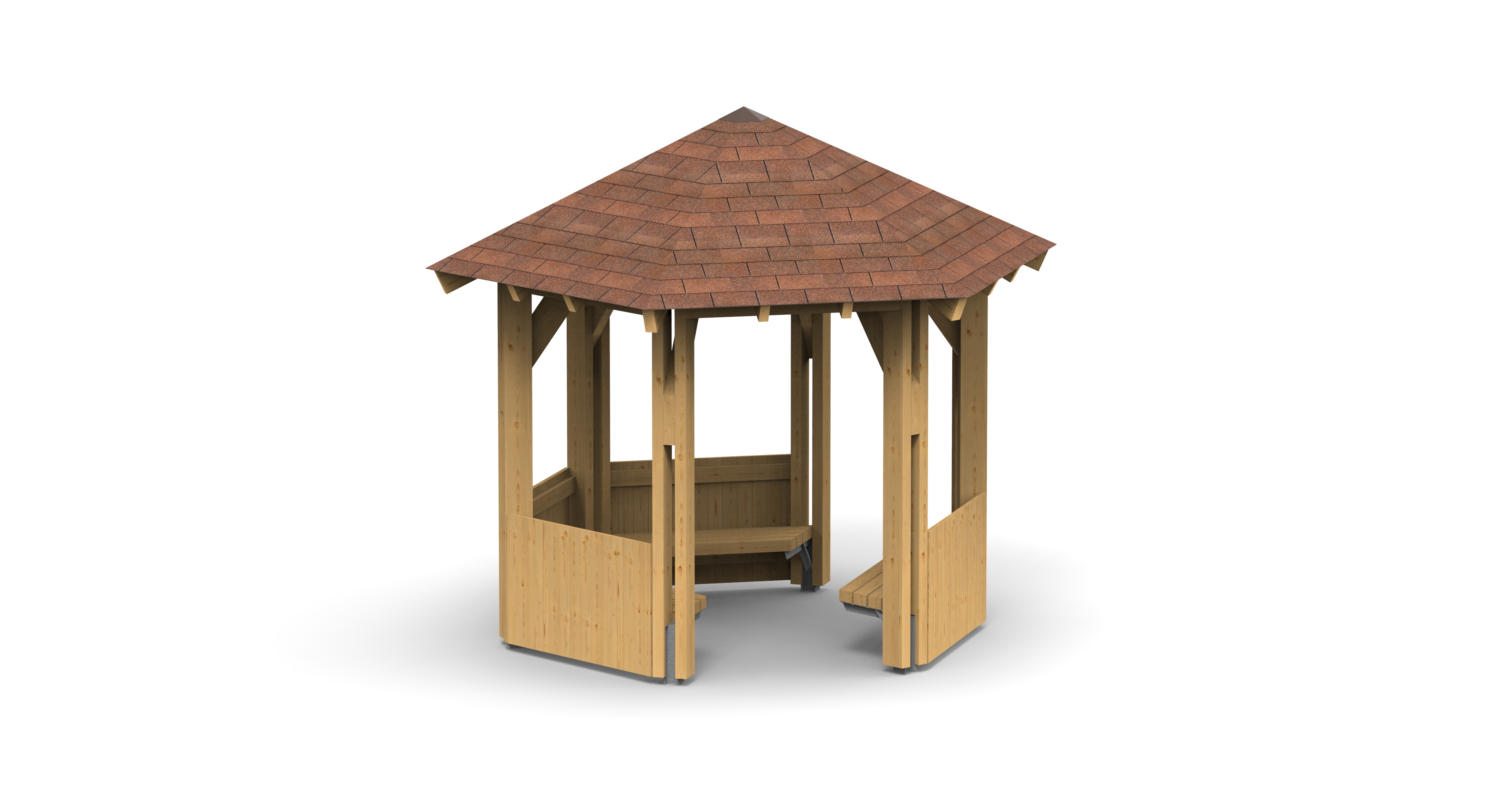 Šestiboký altán průměru 6 m. Krytina z asf. šindele. Standardní provedení zahrnuje 4 zástěny s lavicí. Jiná provedení jsou na přání možná.