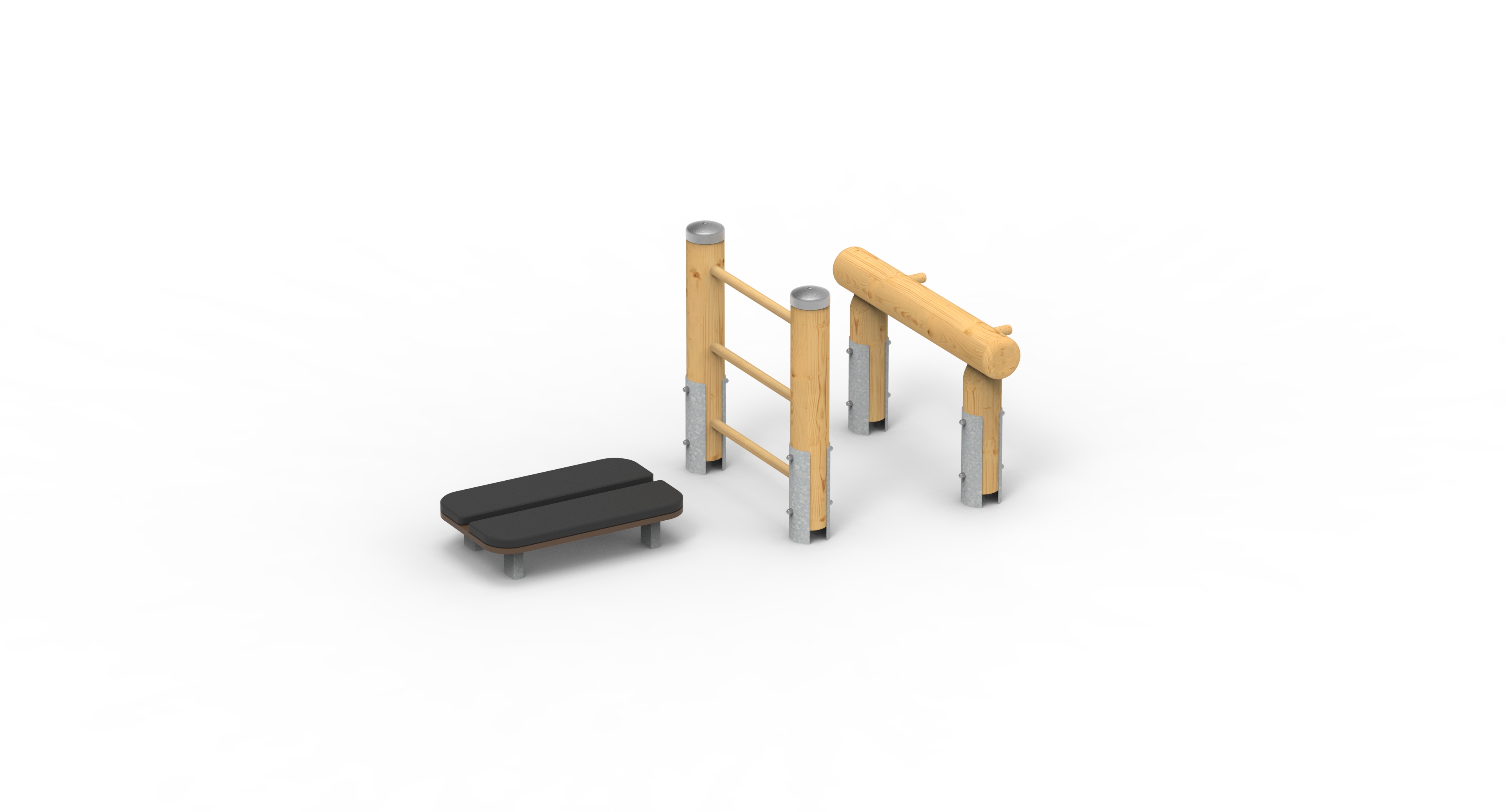 Sestava zahrnuje lavičku s pružným povrchem, žebřík k opření nohou a opěru s madly pro hyperextenze.