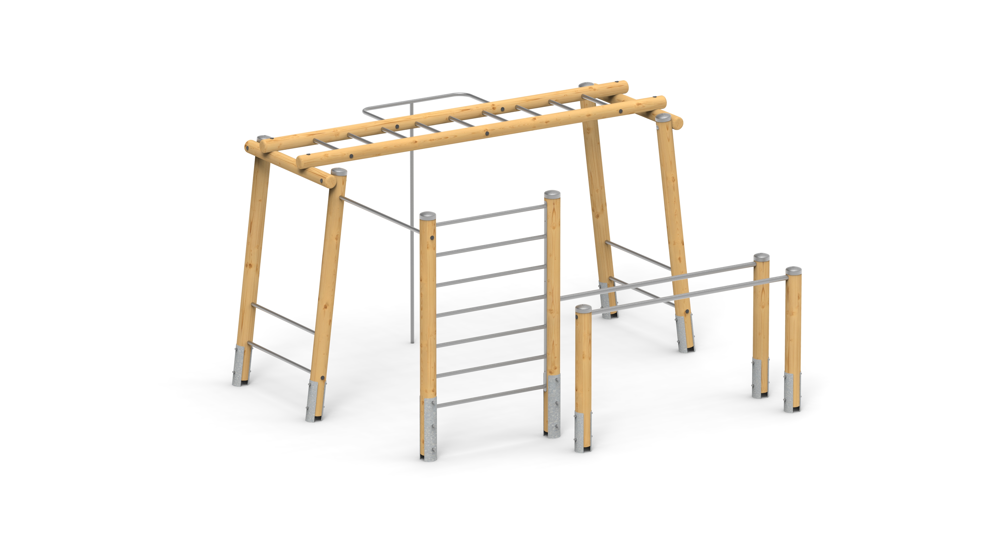 Sestava ručkovadla, žebřin, hrazdy a bradel. Kliky lze provádět na nástupech od ručkovadla. Spousta možností na malé ploše.