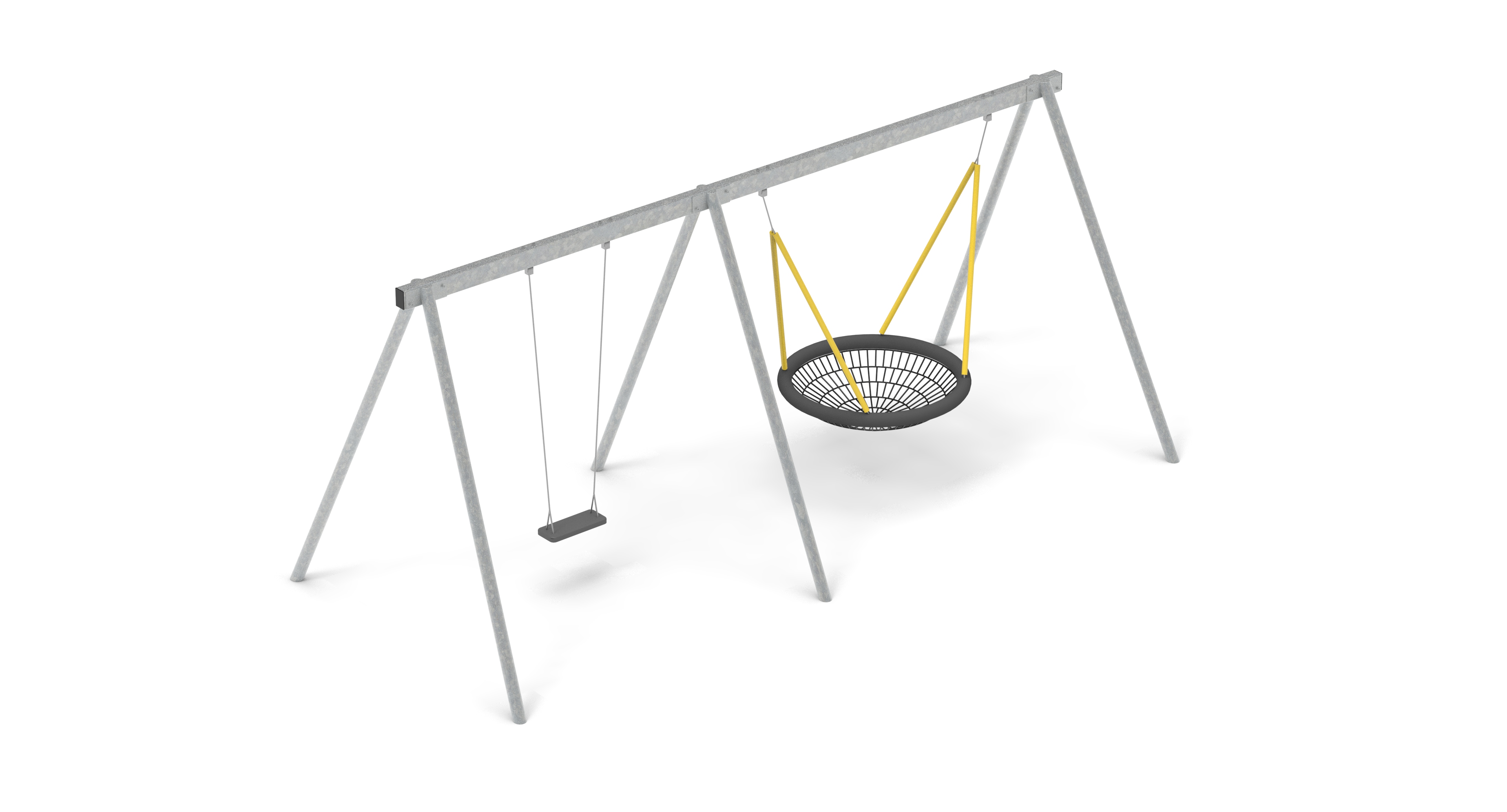 Kombinovaná houpačka pro vysoce namáhaná hřiště. Velmi stabilní a odolná proti zničení. Hnízdo s košem z plastových spojek. Ideální pro exponovaná veřejná hřiště s neomezeným provozem.
