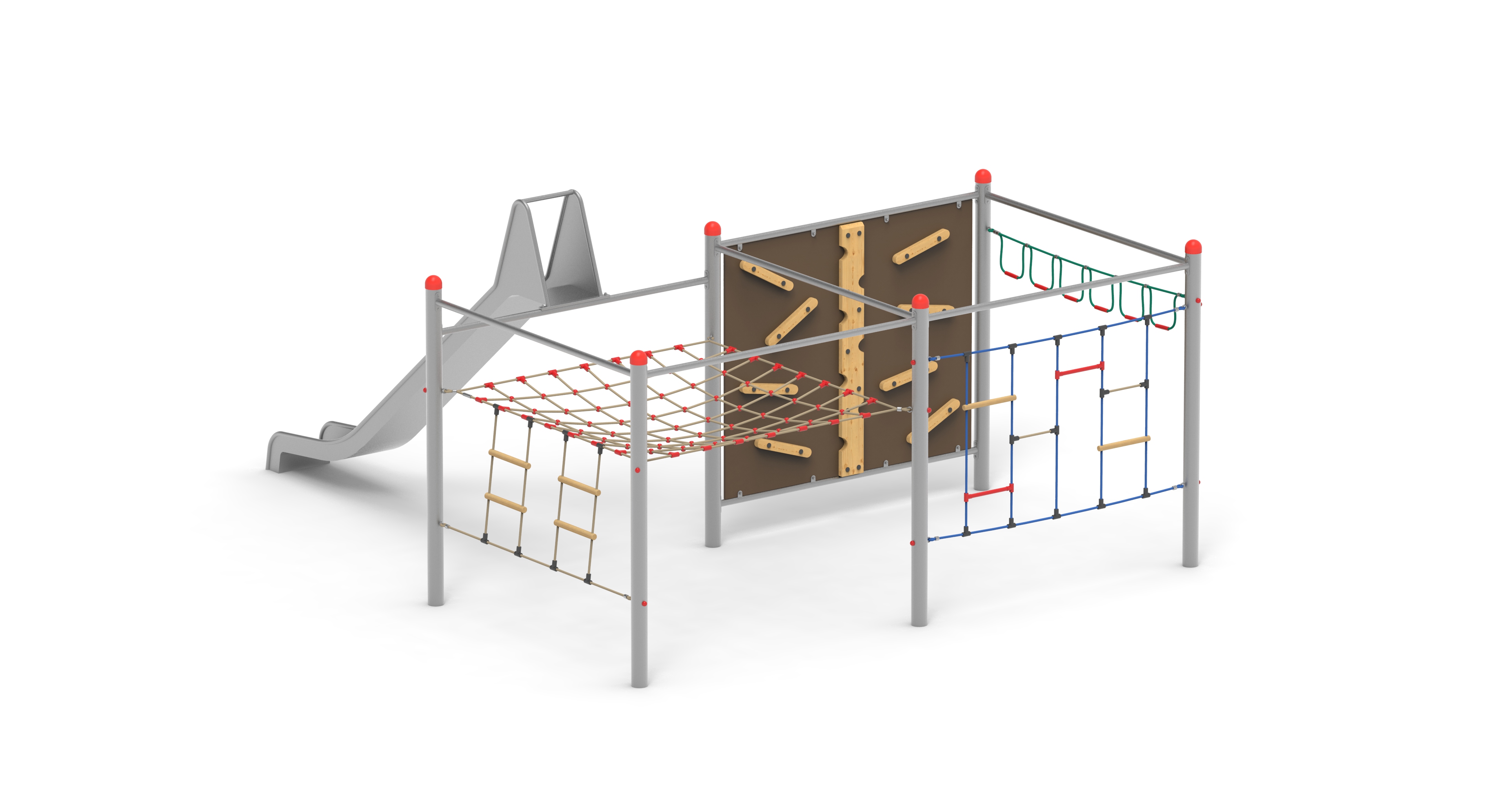 Hlavně prolézací "lanáč" pro děti školního věku. Skluzavka 2 m.