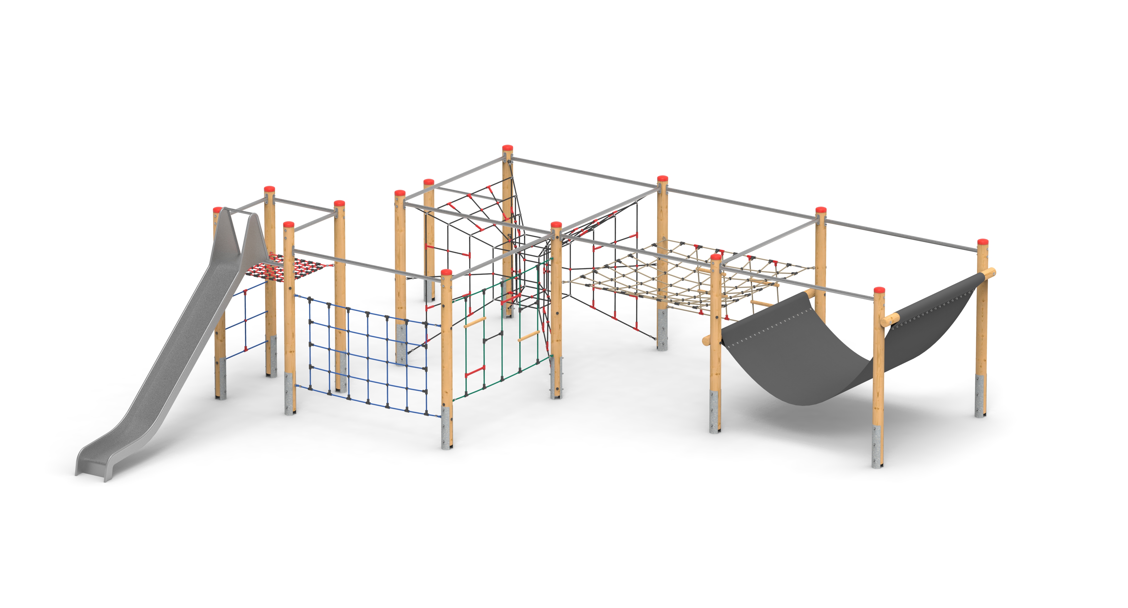 Prolézací sestava pro děti školního věku. Hrazda s výškou 1,6 m a 2 m vysoká nerezová skluzavka.