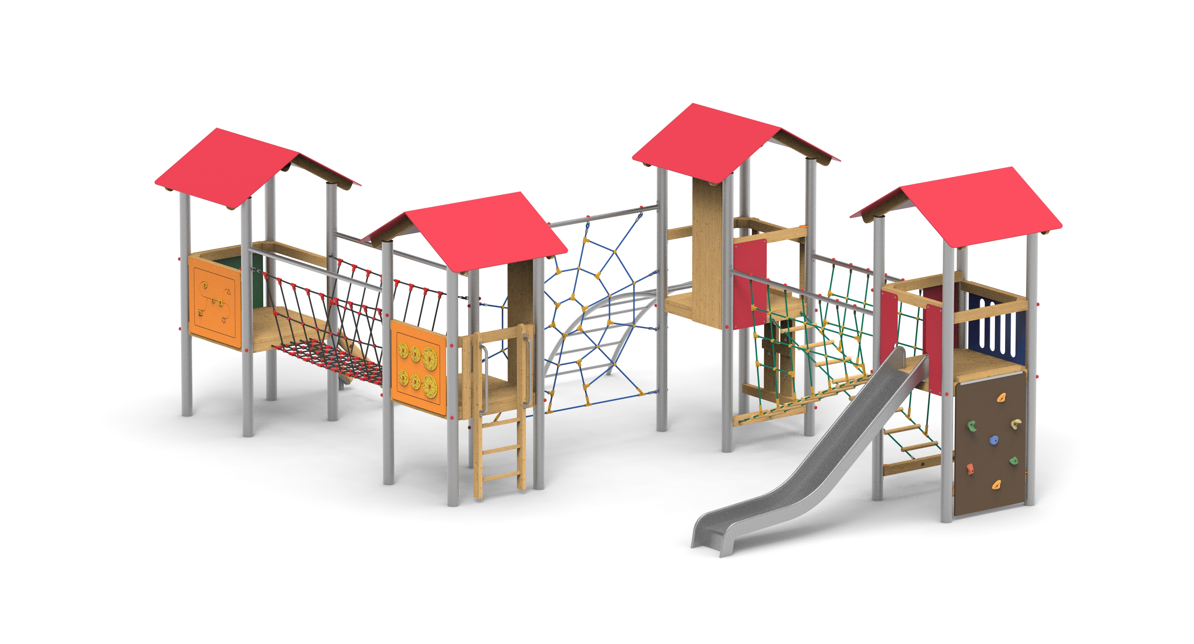 Bohatá sestava s řadou lanových prvků a panelem "počítání". Skluzavka výšky 1,4 m.