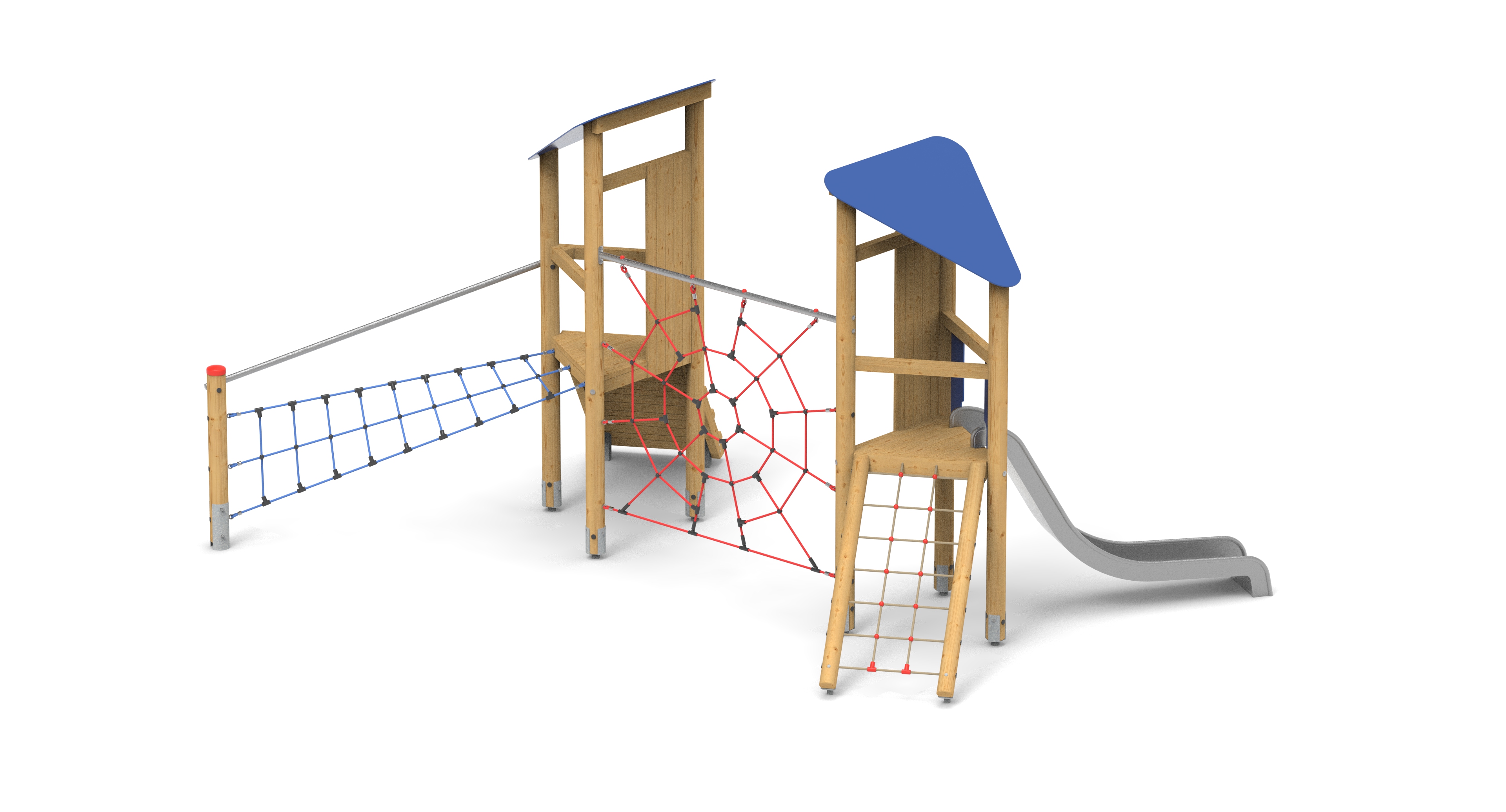 Dvě trojboké věže s pultovou střechou spojené pavučinou.