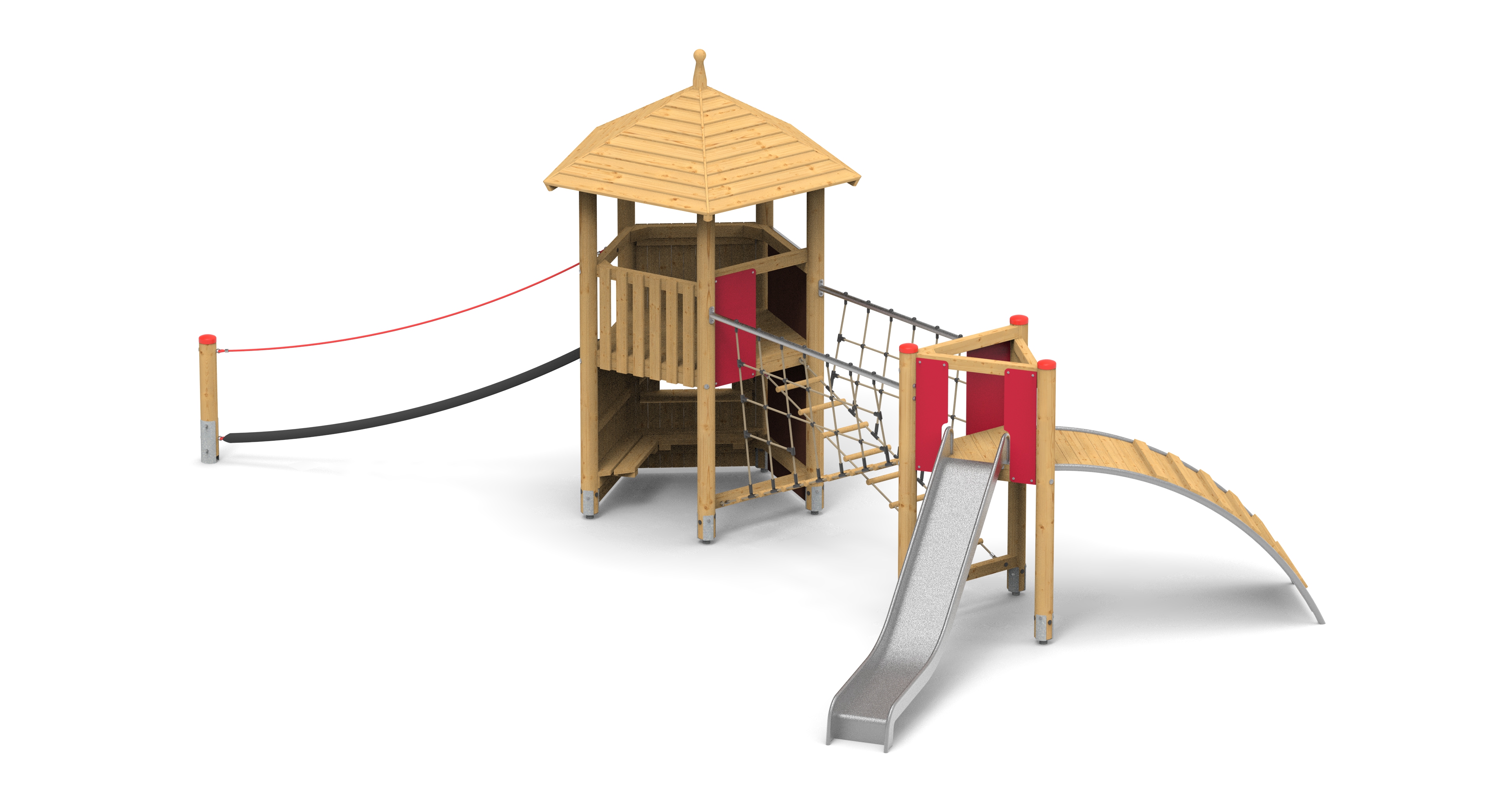 Kombinace pětiboké a trojboké věže propojené cik-cakem. Posezení uvnitř věže.