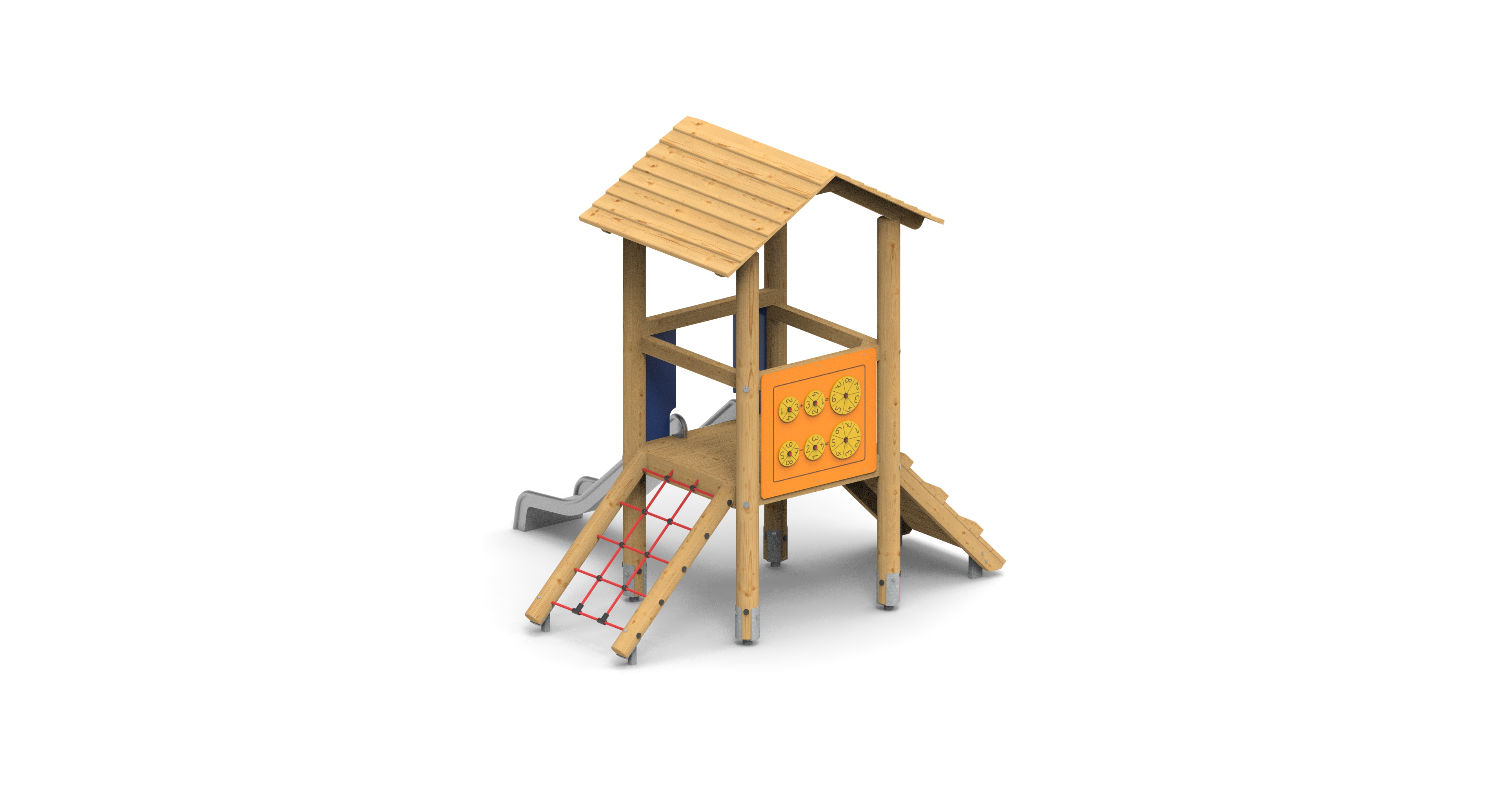 Čtyřboká věž se sedlovou střechou, skluzavkou a dvěma šikmými výstupy. Výška podesty 1 m.