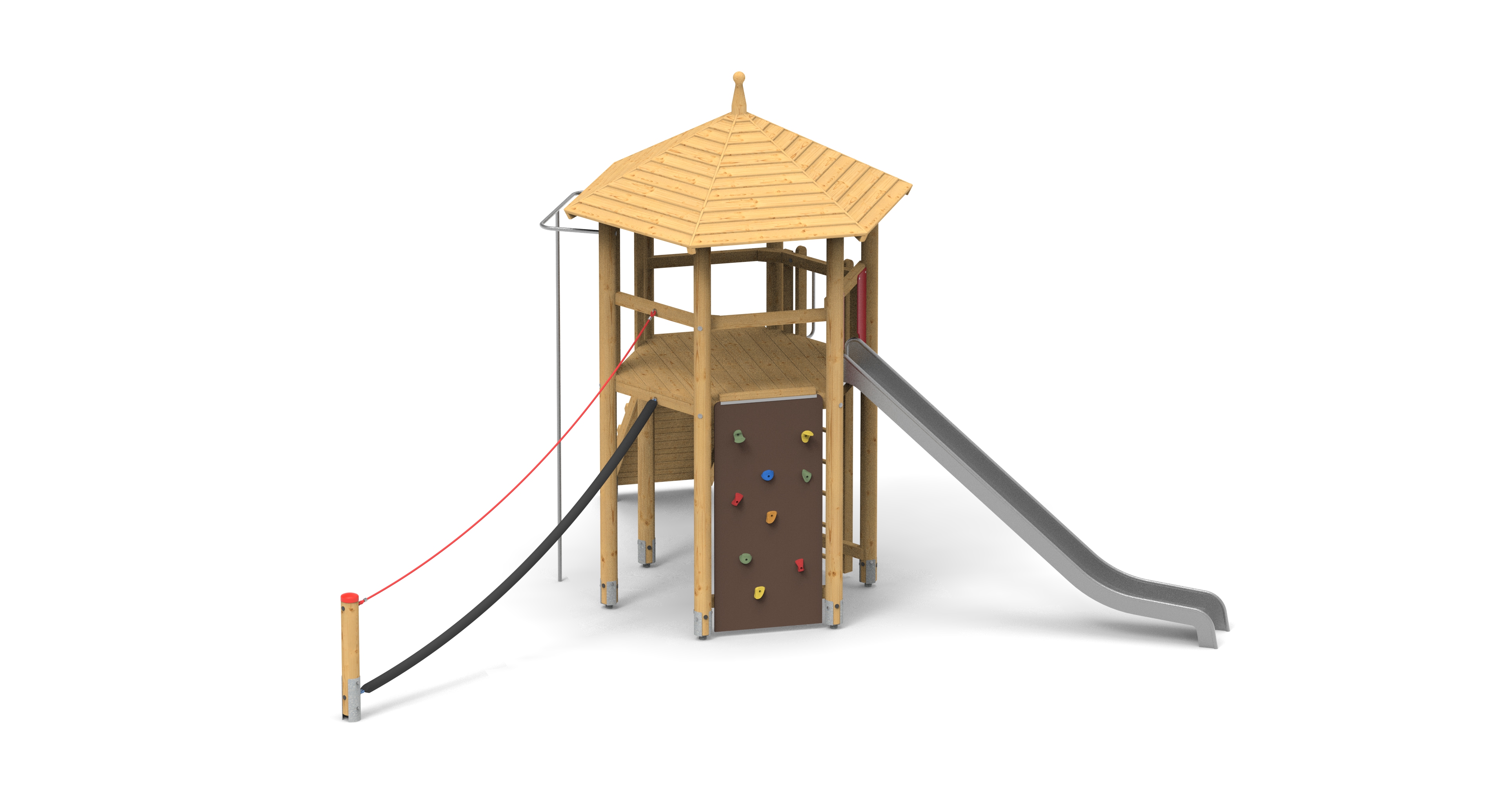 Plně vybavená šestiboká věž s balančními i lezeckými prvky a dlouhou skluzavkou. Výška podesty 2 m.