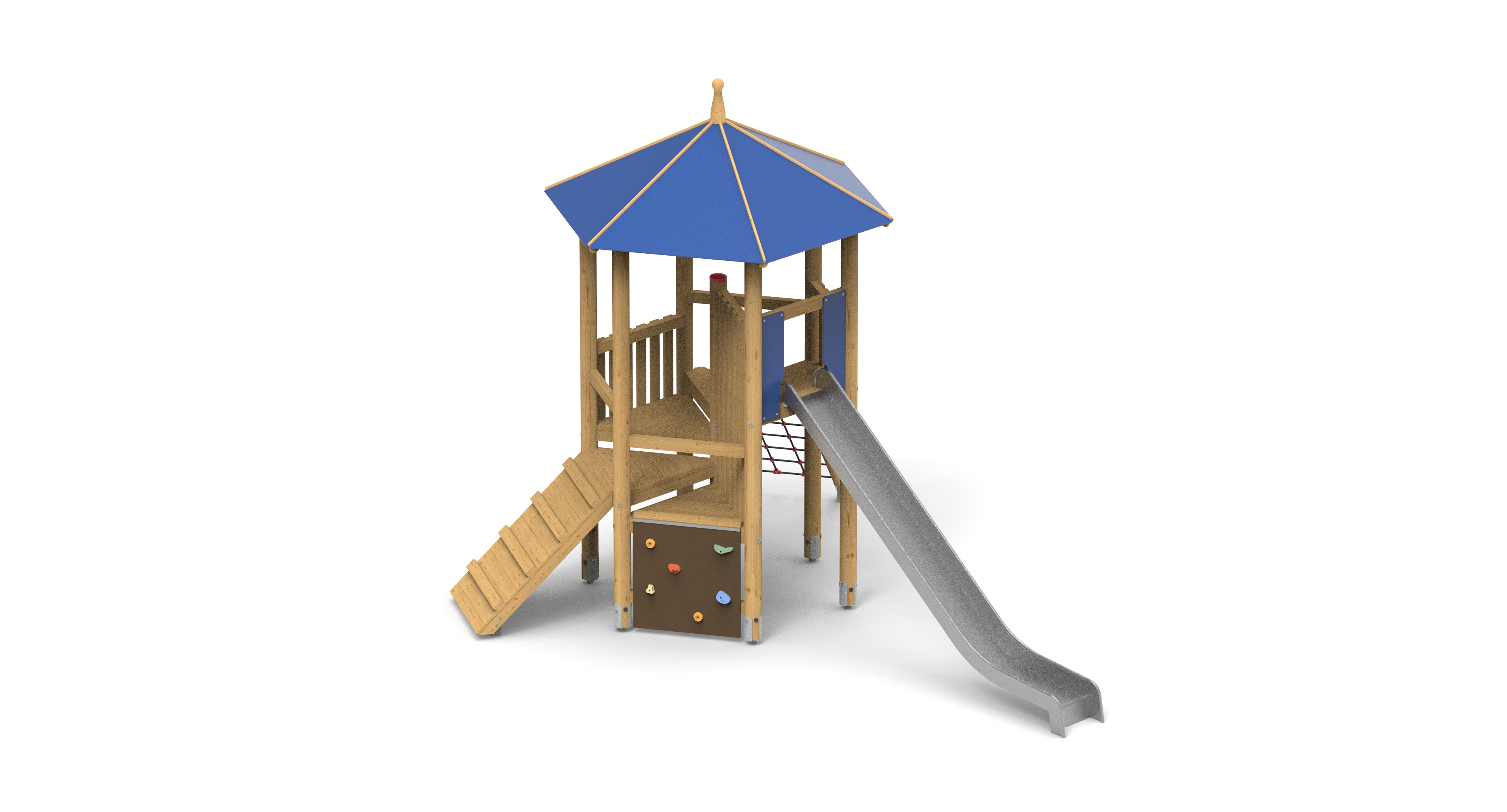 Šestiboká věž vyskládaná z trojbokých podest v podobě "točitého schodiště".