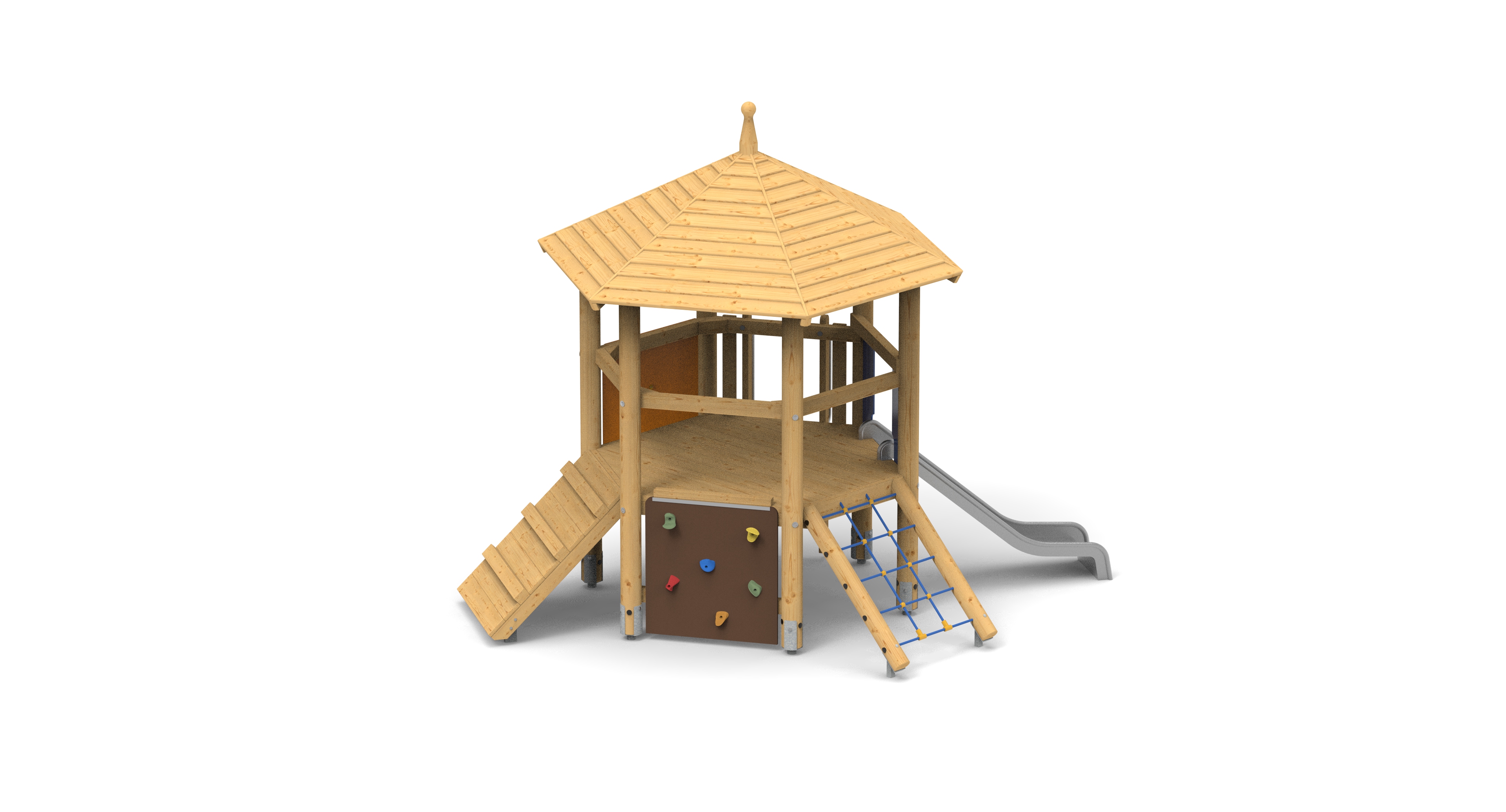 Šestiboká věž se skluzavkou a fyzicky nenáročnými výstupy. Vhodná do školek. Výška podesty 1 m.