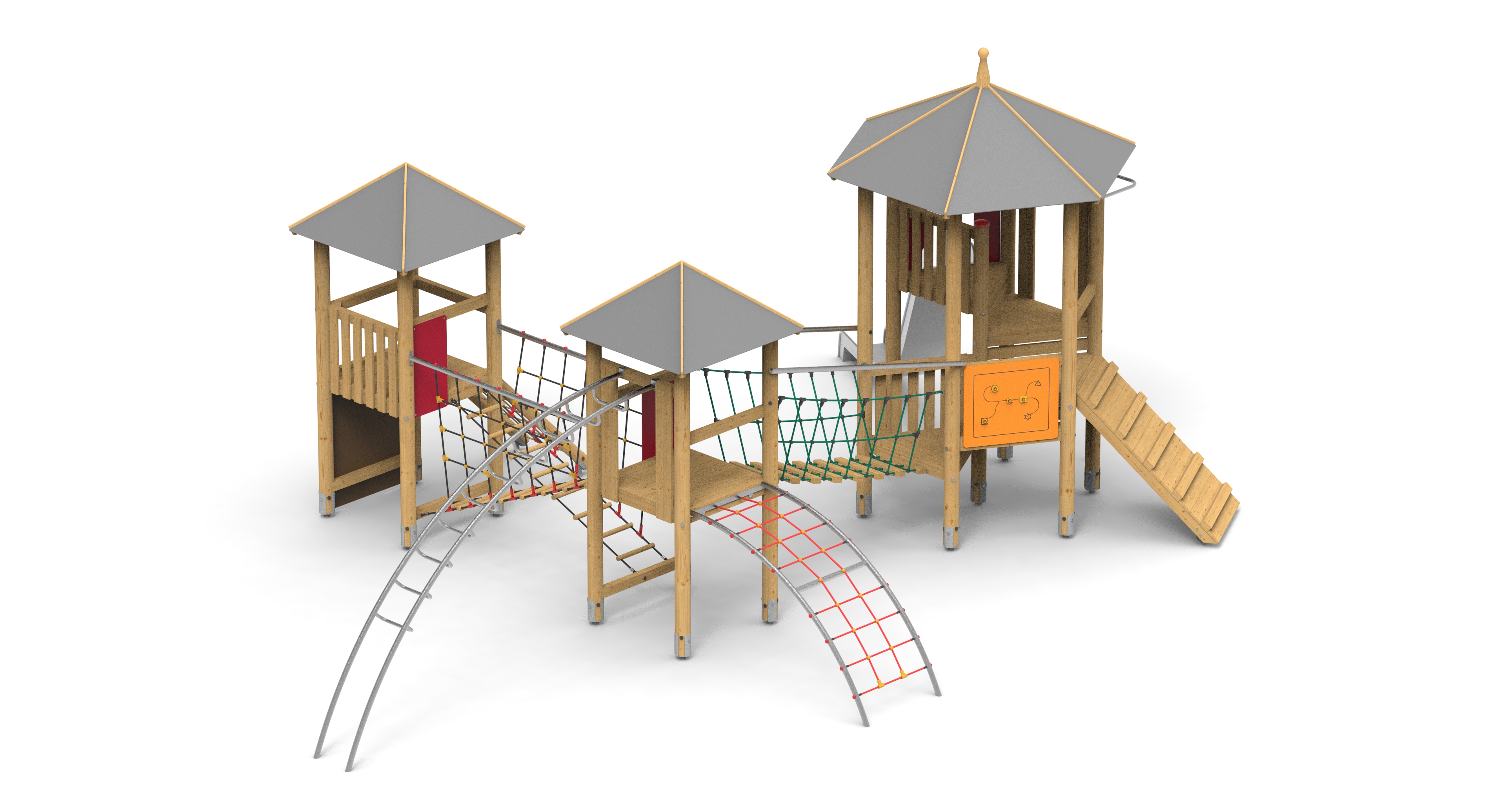 Dvě čtyřboké věže s podestou 140 cm a šestiboká věž skládaná z trojbokých podest. Skluzavka 2m z nejvyššího místa.