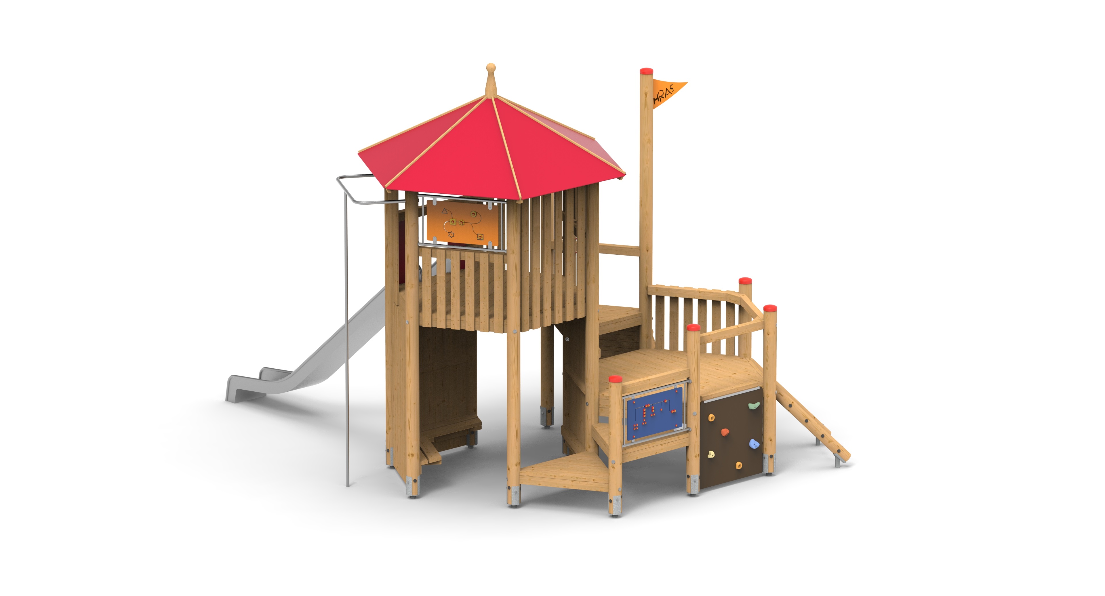Kompaktní sestava šestiboké věže a podesty, propojení trojbokými podestami. Posezení uvnitř věže.