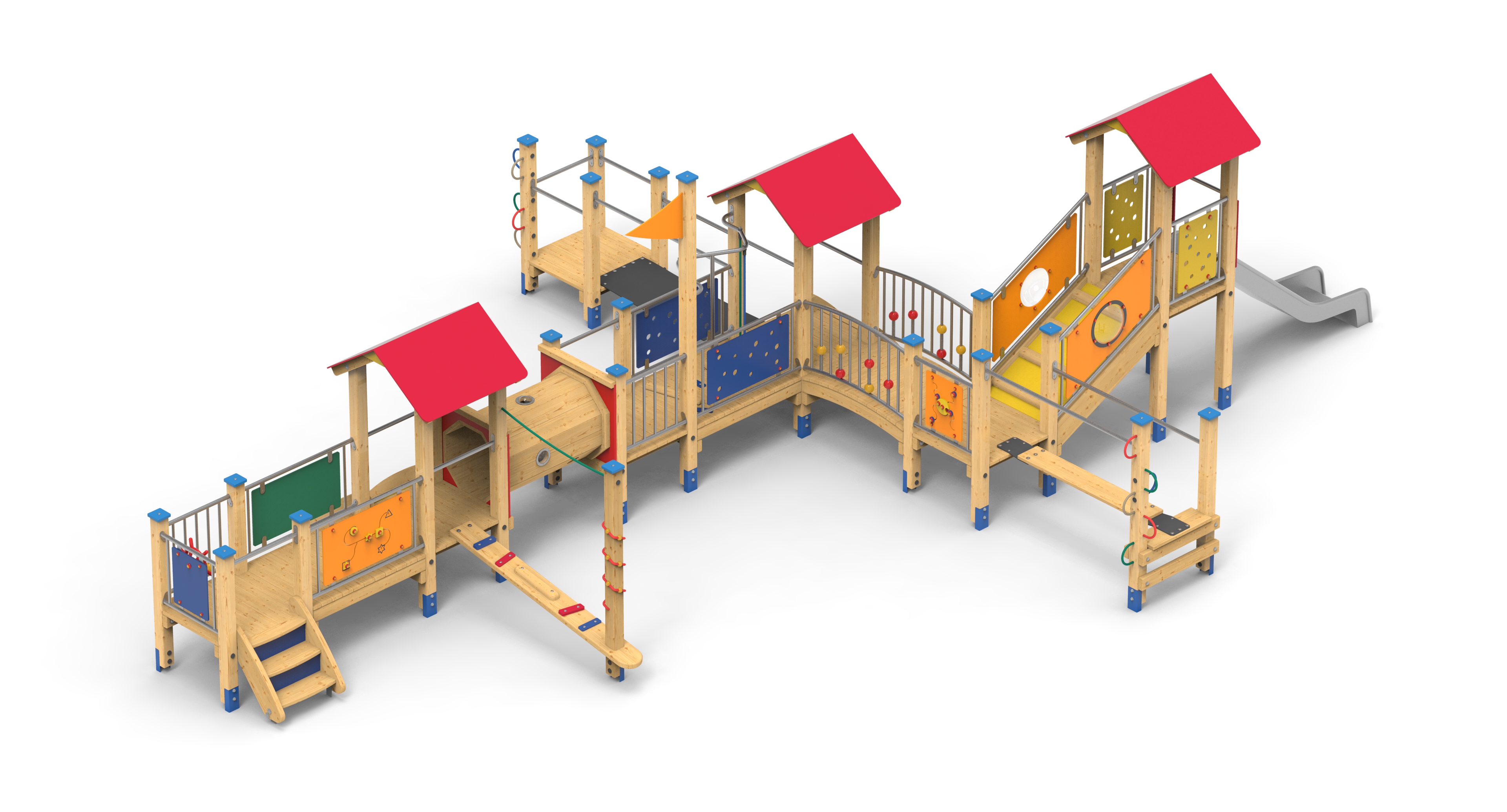 Atraktivní velká sestava s nerezovou skluzavkou a spoustou prolézacích a motorických prvků. Výška podest 1 a 0,5 m.