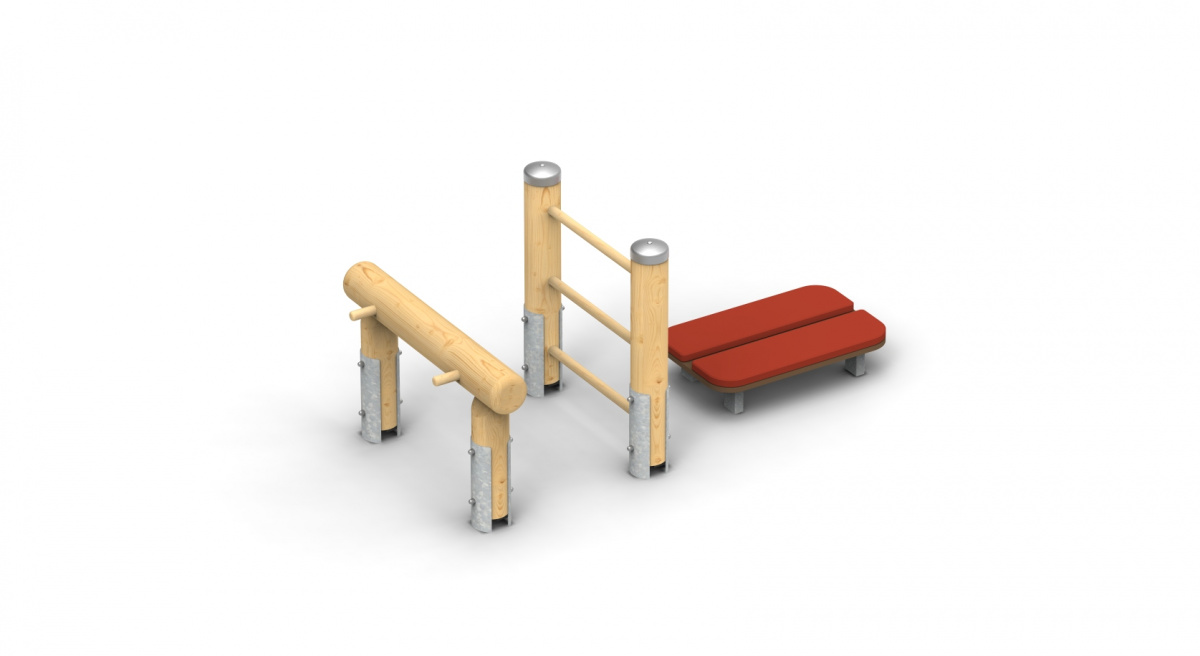 Sestava zahrnuje lavičku s pružným povrchem, žebřík k opření nohou a opěru s madly pro zvedačky břichem dolů.